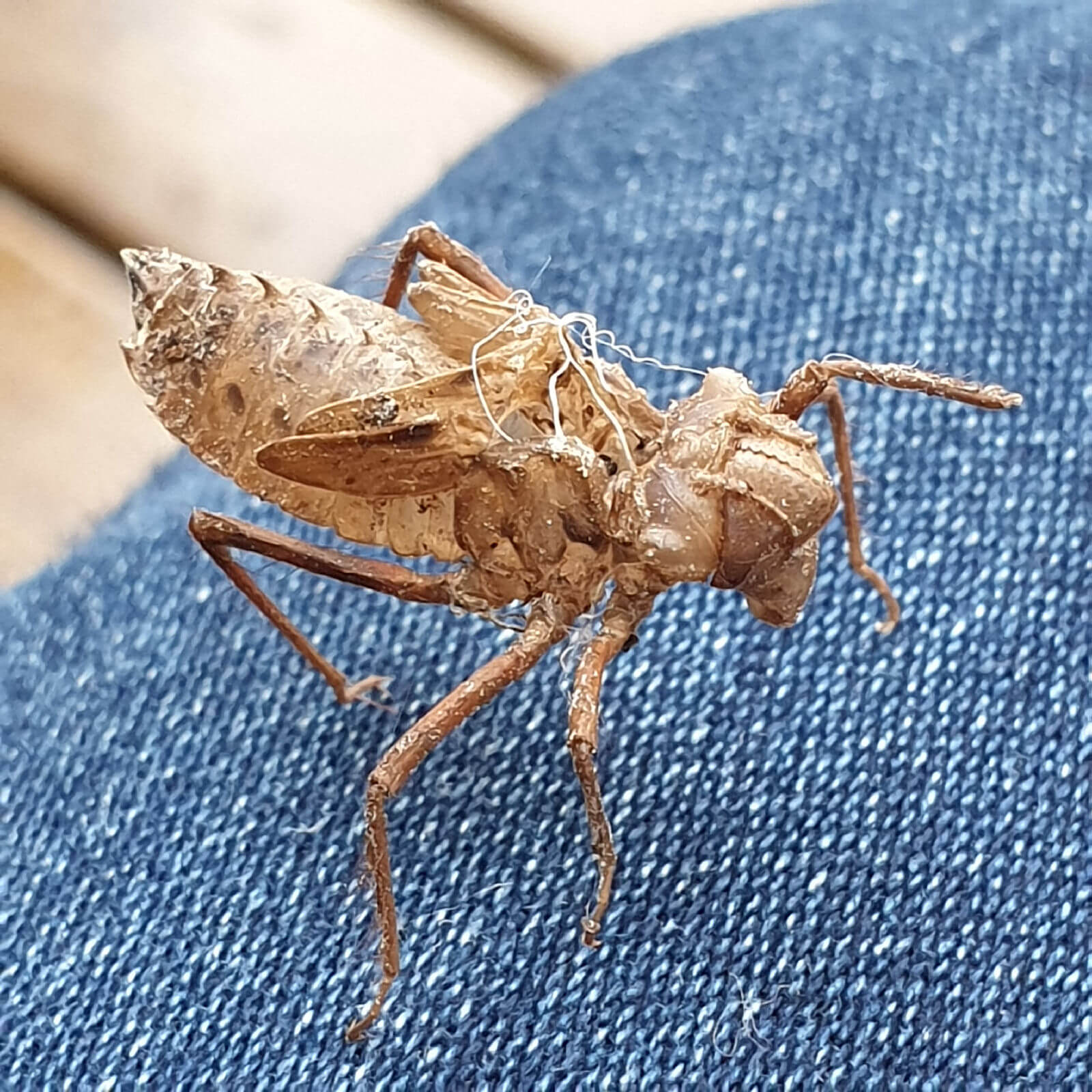 Korennot Sudenkorennosta on jäänyt jäljelle tyhjä kuori, kun se on lähtenyt täysikasvuisena lentoon siivet kuivateltuaan. Hepokatit Heinätöpökattinaaraita.