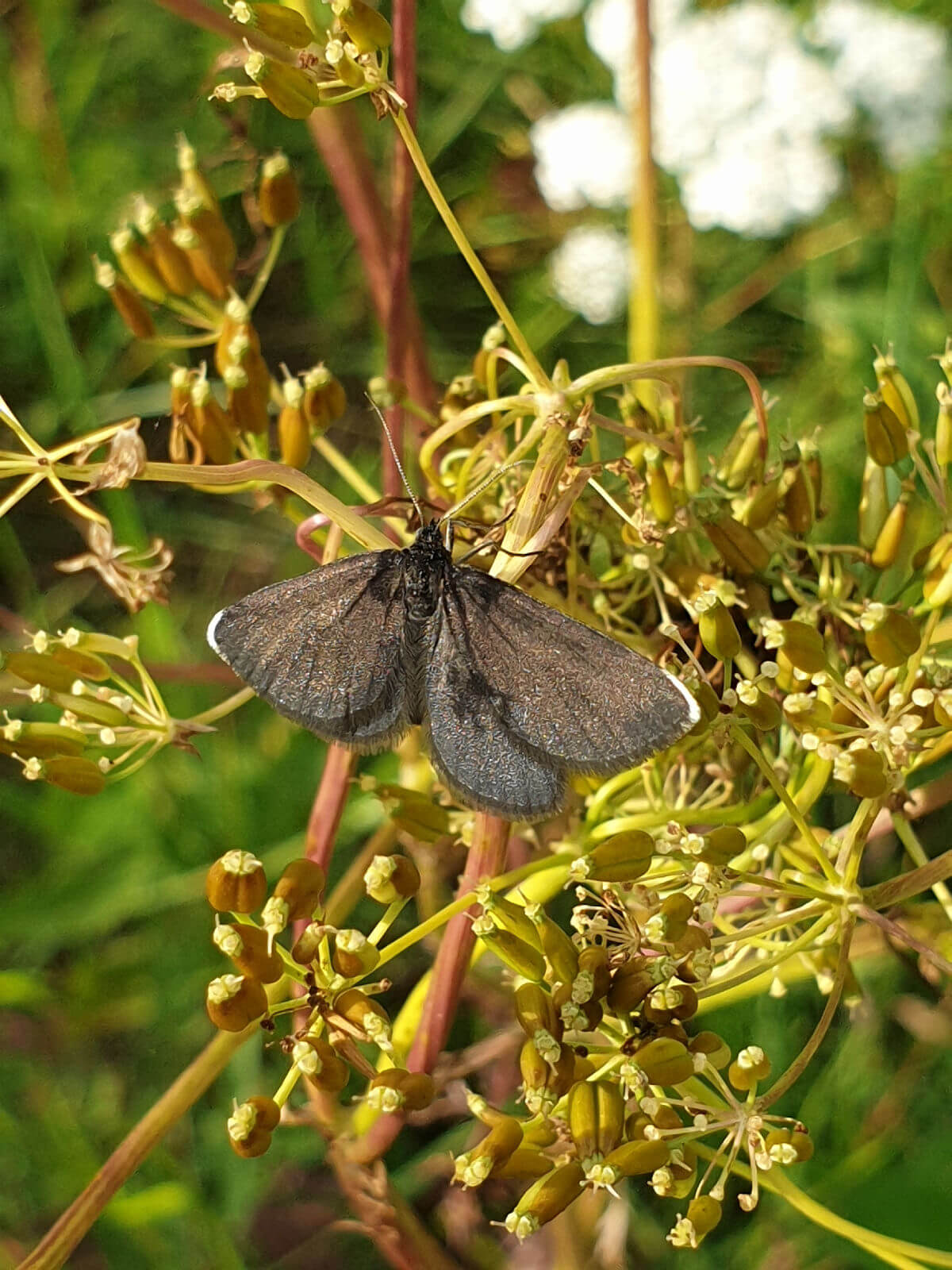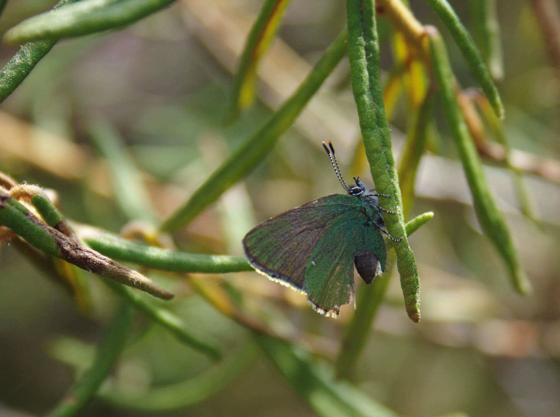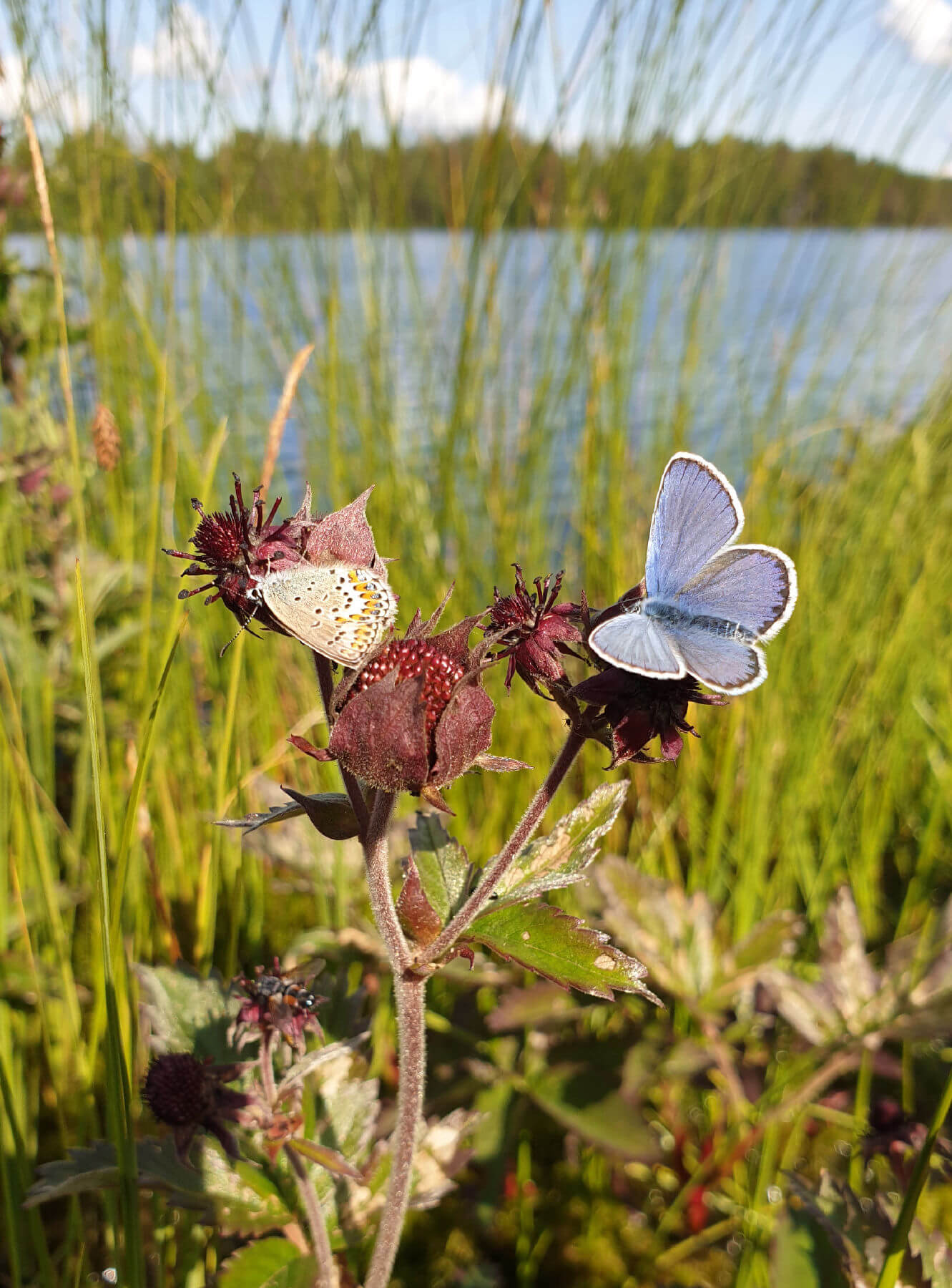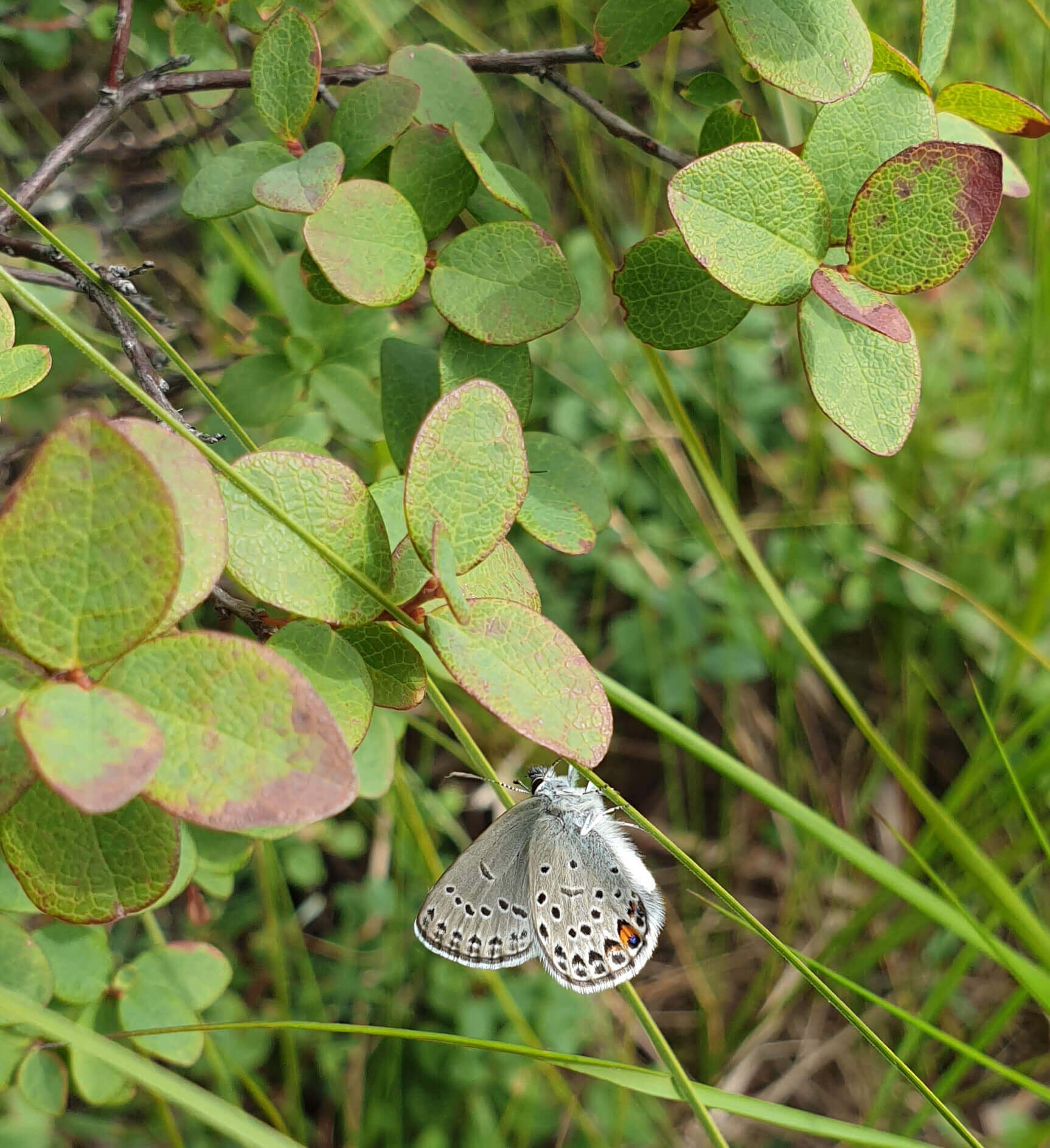 Sinisiipi kiipeää heinää myöten mustikan varvulle. Kuvattu 2020 Sysilammen maastossa Perhossa.